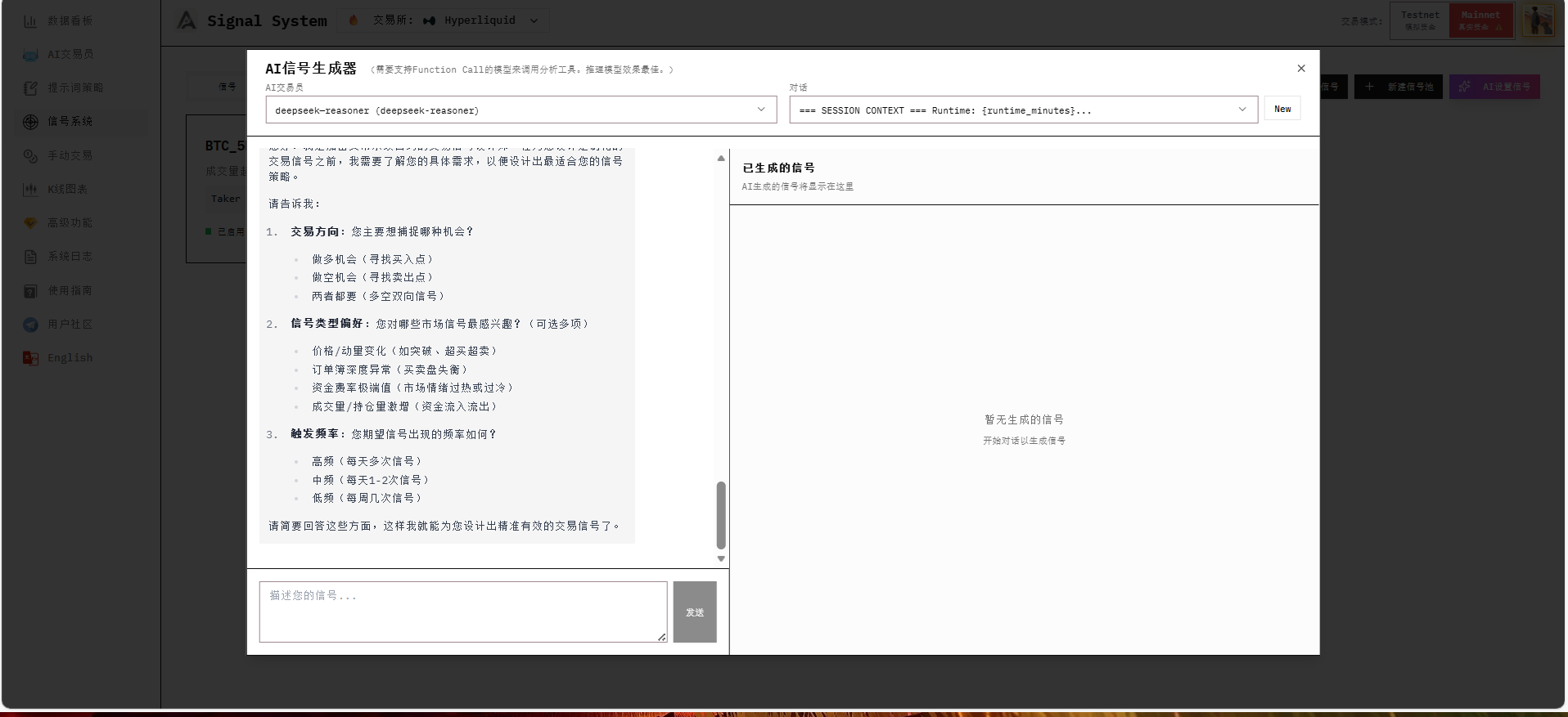 If you clearly know which signals your strategy needs, you can tell AI directly. If you also know the exact values, you can manually create signals and signal pools.